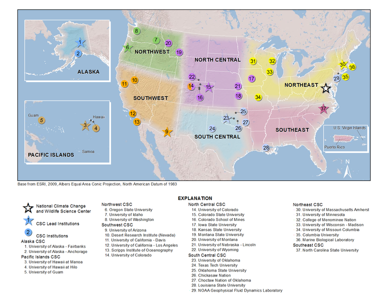Host institutions for Climate Science Centers were chosen competitively, with one exception. The exception to this selection process was for the Alaska Climate Science Center. A current list of consortia for all USGS Climate Science Centers is located at http://www.doi.gov/csc/images/CSC_consortia_and_regions_2012.png. Strong candidate institutions or consortia had established links with natural resource management issues and entities, within the Department of the Interior and more broadly. Thus, institutions with elements such as Fish and Wildlife Cooperative Units, Cooperative Ecosystem Study Units, Regional Integrated Science and Assessments, Forest Service research offices, and similar science-to-management efforts were favorably considered. USGS sought partners that could bring together appropriate scientific capabilities, space and facilities, outreach or extension services, data management, networks, computational services, or super-computing capacity from the organization or collaborating partners.