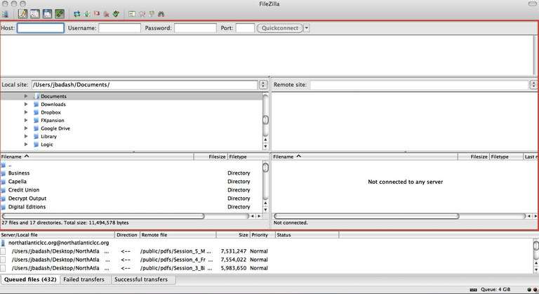 Screenshot of FileZilla's opening window. The area that we will using the most is enclosed in the red box: