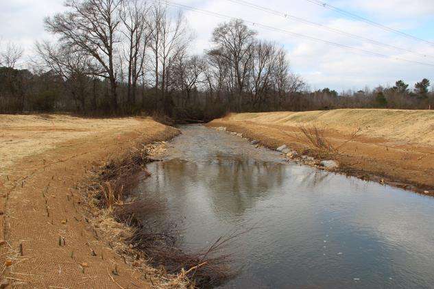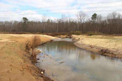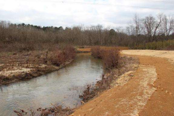 In order to improve the overall habitat in the Raccoon Creek watershed TNC has been partnering with DNR, USFWS, and Paulding County to identify future protection and restoration sites and educate local landowners on how the management of their property impacts the watershed. In 2008/2009 TNC identified and prioritized major stream crossings inhibiting natural fish passage along the mainstem of Raccoon Creek in Paulding and Bartow Counties and began collaborating with Georgia Power on a plan to restore a 6,441 linear foot reach of Raccoon Creek impaired by a power line right-of-way just downstream from the Paulding County WMA. A conceptual design for the site revealed 9 project sites that needed to be restored in order to recreate a stream buffer, diversify habitat, and create a stable dimension, pattern, and profile which would reduce future erosion and sedimentation, and improve water quality, connectivity, and in-stream aquatic habitat. This restoration resulted in 5,750 linear feet of buffer planted and 2,250 linear feet of stream banks restored. TNC established a 25 year encroachment agreement with Georgia Power to ensure the long term success of the Georgia Power restoration site project. TNC received PFW FY 2011 and 2012 Landscape-scale Grants, as well as a FY2011 Southeast Aquatic Resources Partnership Grant (SARP) to complete the remaining Georgia Power restoration sites and continue conservation and protection work throughout the Raccoon Creek Watershed.
